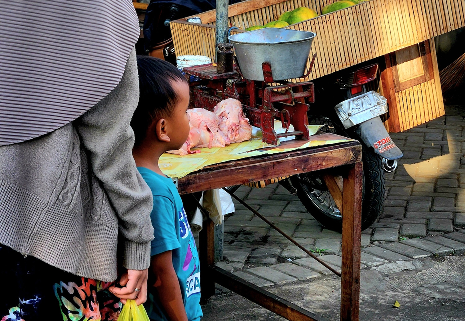 Di perjalanan pulang, bertepatan lewatnya kereta api saya ikut mengantri dan menunggu kereta api lewat di depan palang pintu kereta api. Saat mengantri saya sempat mengabadikan moment disekitar dengan handphone, terlihat di sebelah kiri saya ada anak kecil yang ikut belanja ayam dengan ibunya dan menunggu datangnya kereta.